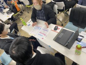 その後、各企業ブースにおいて15分間の説明と質疑応答を2クール実施する形式で交流が行われました。当法人のブースには計4名の生徒さんが来訪され、非常に積極的に質問をしていただきました。